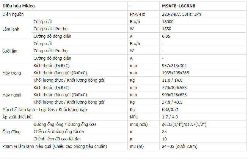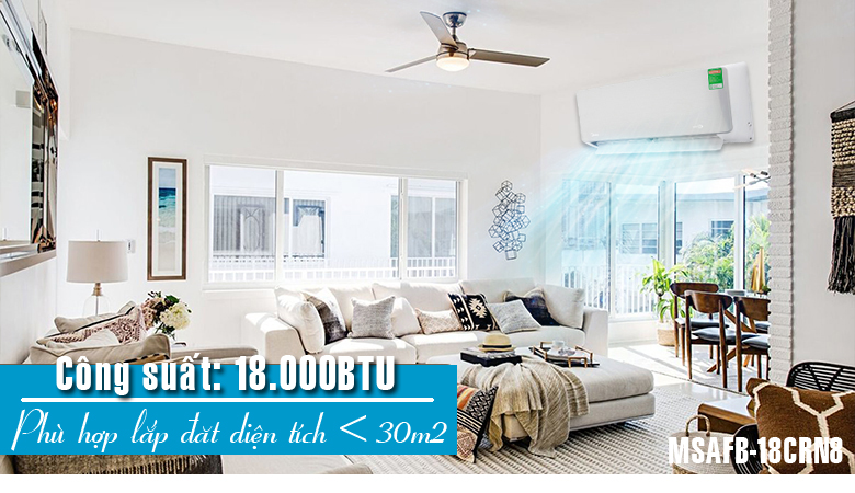 Với công suất 18000BTU MSAFB-18CRN8 phù hợp lắp đặt cho căn phòng có diện tích < 30m2 như phòng khách, phòng làm việc,...