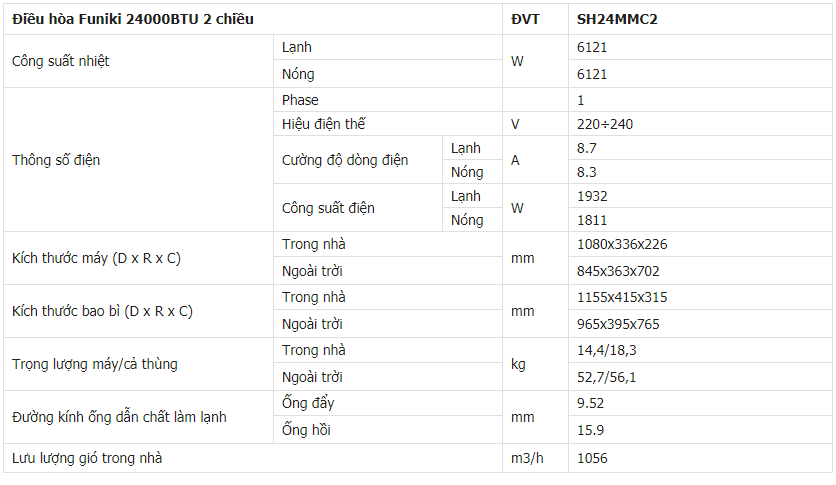 Thông số kỹ thuật điều Hòa Funiki 24000btu 1 chiều model HSH24TMU