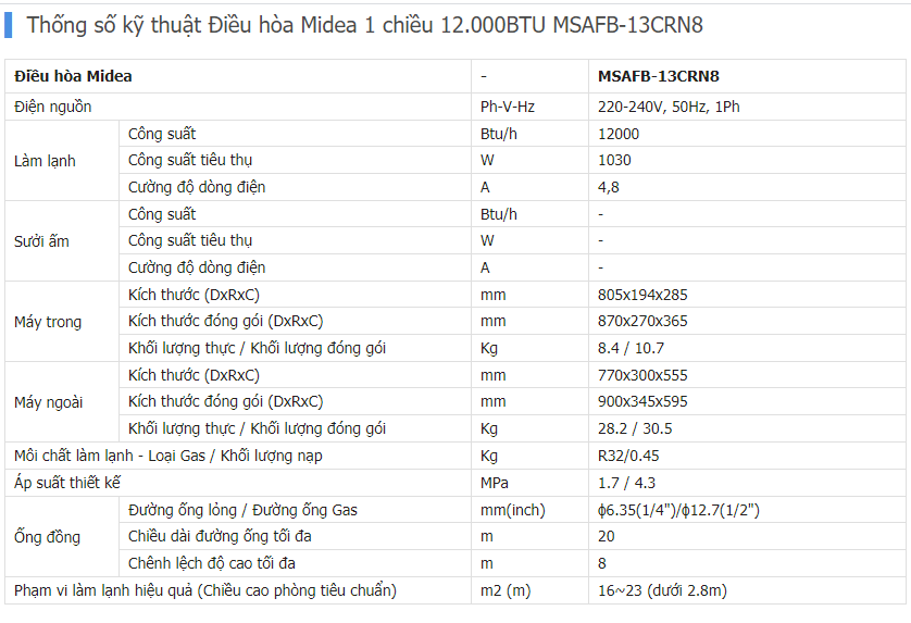 Điện máy Minh Phương xin gửi đến quý khách hàng dòng sản phẩm điều hòa MIDEA 1 chiều MSAFB-13CRN8 mới nhất 2020, hàng Việt Nam chất lượng cao, giá bán tin cậy phù hợp với người dùng Việt và các công trình xây Dựng.